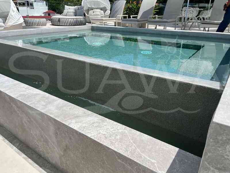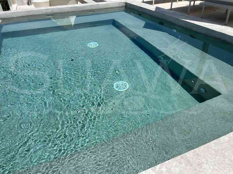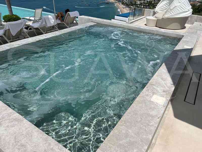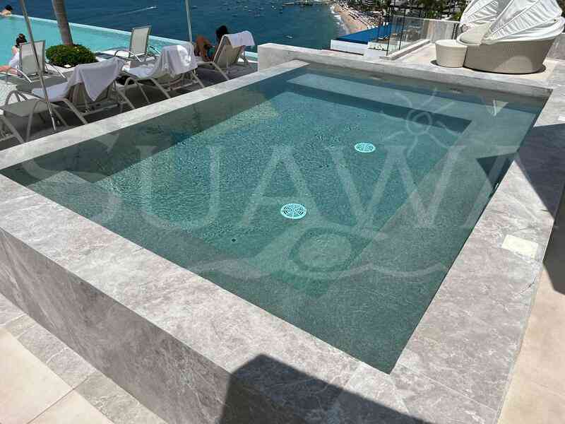 GALERÍA » Jacuzzi en Condominio Construcción y equipamiento de jacuzzi para 8 personas cómodamente sentadas, acabado en Pebble Creto Suawa color gris. equipado con Equipo Generador de Cloro a base de sal.